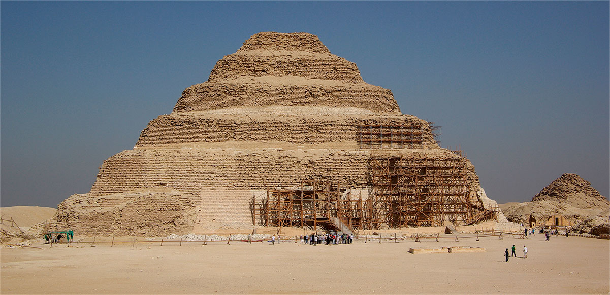 Поразительно, но мы знаем имя архитектора, построившего первую пирамиду для своего царя Нечерихета в 27 в. до н. э. Его звали Имхотеп, он был жрецом бога Ра, астрономом, медиком, архитектором, мудрецом и близким другом — «побратимом» царя. Именно к имени Имхотепа восходит египетская традиция мудрости. Ему приписывают не только сооружение первой пирамиды, но и создание египетского календаря, на основе которого был создан современный, которым пользуемся мы. Для своего царя, которого более поздние поколения древних египтян назвали Джосером, то есть священным предком, в столичном некрополе, который сейчас называется Саккара (в 30 км к югу от Каира), он соорудил пирамиду высотой 60 метров, состоящую из шести ступеней. Это лестница, по которой царь после смерти восходит на небо. Под пирамидой не только погребальная камера и целый подземный дворец, стены которого были облицованы более чем 36 тысячами ярко-бирюзовых фаянсовых плиток, но и огромный лабиринт ходов, хранилищ и дополнительных погребальных камер для членов царской семьи. Общая протяжённость ходов под пирамидой превышает 7 км. Вокруг пирамиды — ритуальный комплекс, каменные модели крупнейших храмов страны и «сердаб» — тайная камера, в которой находилась статуя царя, изображавшая Ка — его двойника, который должен был после смерти владыки принимать подношения, ставившиеся в соседнем зале. Статуя, а вернее, обитавший в ней, по мнению египтян, дух царя, могла видеть жертвы через два отверстия, которые были прорезаны в стене на уровне её глаз, некогда инкрустированных горным хрусталём. Статуя сейчас находится в Египетском музее в Каире, однако в Саккаре на её месте находится точная копия, на которую можно посмотреть, прильнув к отверстию в стене жертвенного зала. Весь комплекс был окружён белой стеной из превосходного известняка, которая имитировала знаменитые инбу хедж — древние белые стены города Мемфиса — столицы Египта того времени. Именно в этом комплексе первой пирамиды были заложены основы всей египетской архитектуры; кроме того, это первое монументальное сооружение в истории человечества, построенное из камня, а не из кирпича-сырца. За это творение имя архитектора и мудреца Имхотепа почиталось в Египте до начала новой эры, то есть до конца существования древнеегипетской цивилизации. Величественные кирпичные сооружения, построенные из кирпича предками царя Нечерихета в 28 в. до н. э., хорошо известны — они находятся в некрополе города Абидос на юге страны. Абидос был главной святыней Египта на протяжении многих тысячелетий, здесь был главный культовый центр бога Осириса — владыки иного мира и того бога, который, по преданию, первым победил смерть. Тайные ритуалы Осириса и богов его круга были призваны даровать вечную жизнь сущностям всех умерших. Поэтому в Абидосе, у ущелья Пега, где по легенде находятся главные ворота в иной мир, были погребены древнейшие египетские цари. Их погребения, состоявшие из центральной погребальной камеры и десятков второстепенных помещений, «накрытых» единым монументальным холмом, весьма впечатляют. Из этого холма, также ассоциировавшегося с первым холмом суши, с которого началось сотворение Вселенной, и родилась форма пирамиды — сначала ступенчатой, а с 26 в. до н. э., со времени правления царя Снофру, отца Хуфу, — и истинной, четырехгранно